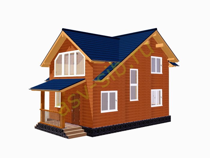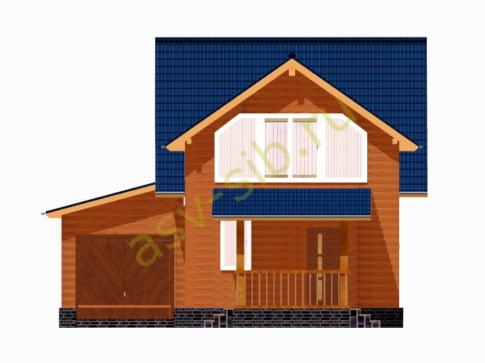 Двухэтажный дом из бруса с гаражом и крыльцом под навесом. Гараж выполнен как отдельное помещение в виде пристройки, но на одном фундаменте с основным объектом. Первый этаж начинается с прихожей с двумя входами в котельную и жилые комнаты. Холл с лестницей и входами в гостиную и санузел. Гостиная совмещёна с кухней для сохранения большего пространства помещения. На втором этаже две комнаты и второй санузел. Дом явно для постоянной эксплуатации небольшой семьей, с учётом возможности использования гостиной как комнаты отдыха. Второй этаж мансардного типа максимально задействован под жилые комнаты.